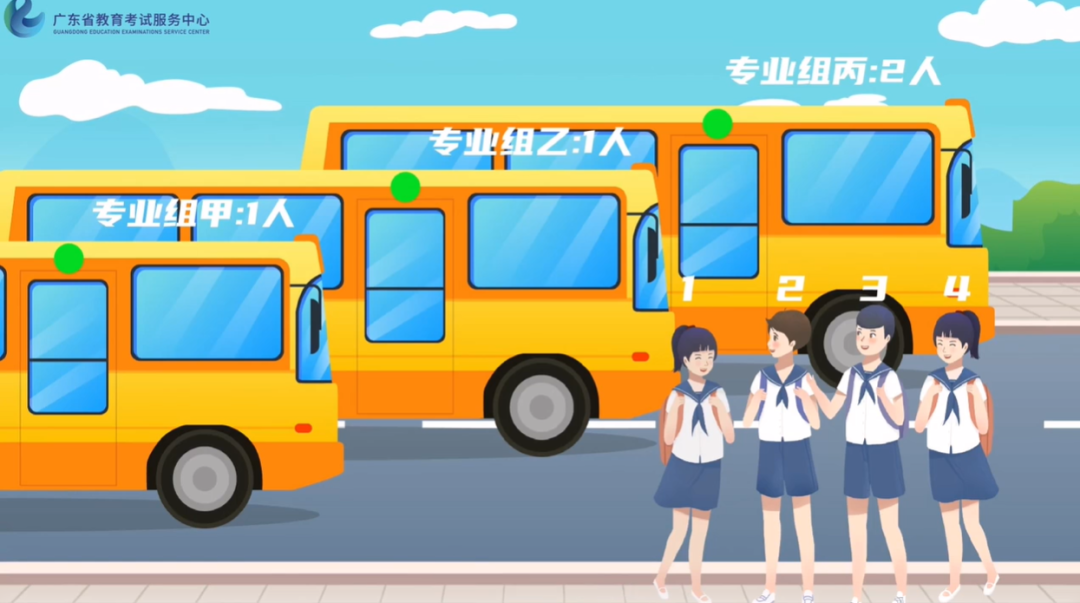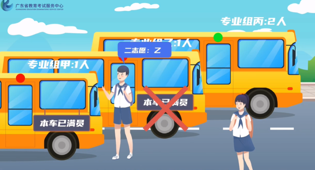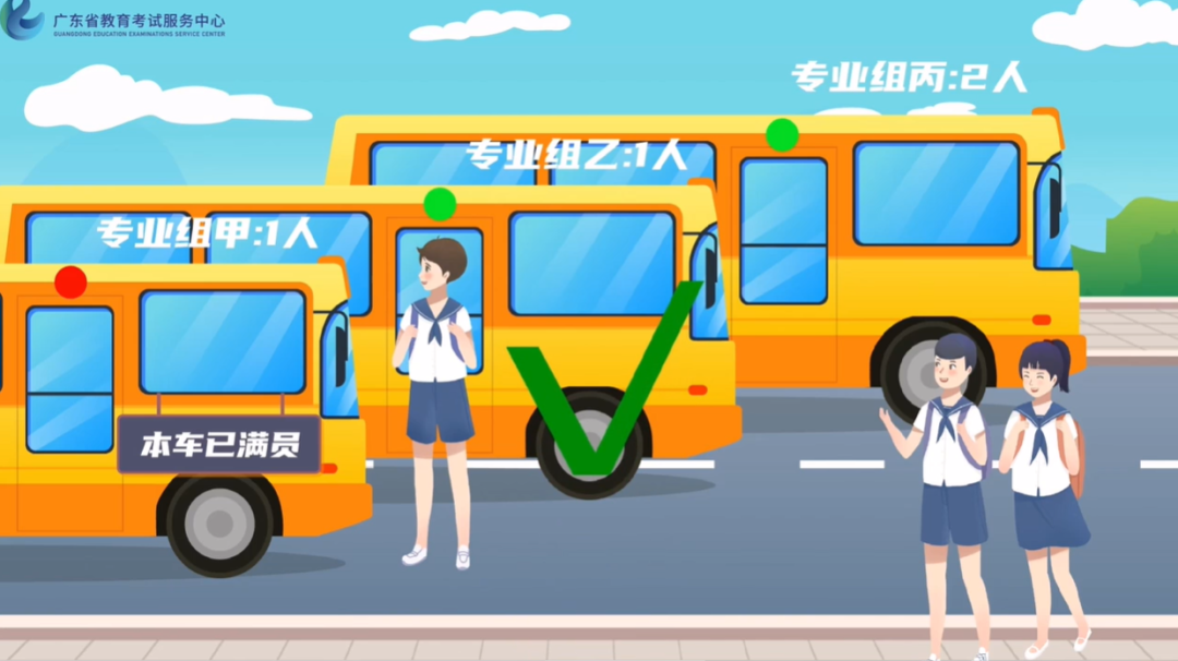 平行志愿的投档过程可以想象成坐公交车,考生是乘客,一辆辆的公交车是各个专业组。乘客按照先来后到的顺序排成一条长队,即分数优先。每次由排名最靠前的人按照自身喜好,即志愿表顺序依次挑选想搭乘的公交车,如果最想坐的那一辆公交车满员开走了,则将继续检索第二喜欢的、第三喜欢的,依此类推。