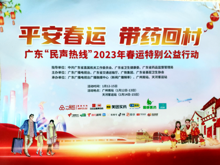 1月14日下午2点30分,刘广源像往年假期一样,从学校拖着行李搭乘地铁来到天河客运站,取票进入了候车厅。再过20分钟,他就可以坐上大巴,并在晚上回到家乡——罗定市船步镇仓地村,和家人团聚,准备过年。但和往年假期不同的是,这次在候车厅,一个名为“平安春运,带药回村”的公益活动正在向旅客们招募“公益带药人”。据介绍,“平安春运,带药回村”公益行动在中共广东省直属机关工作委员会、广东省卫健委、广东省药品监督管理局的指导下,由广东广播电视台广东“民声热线”联合广东省