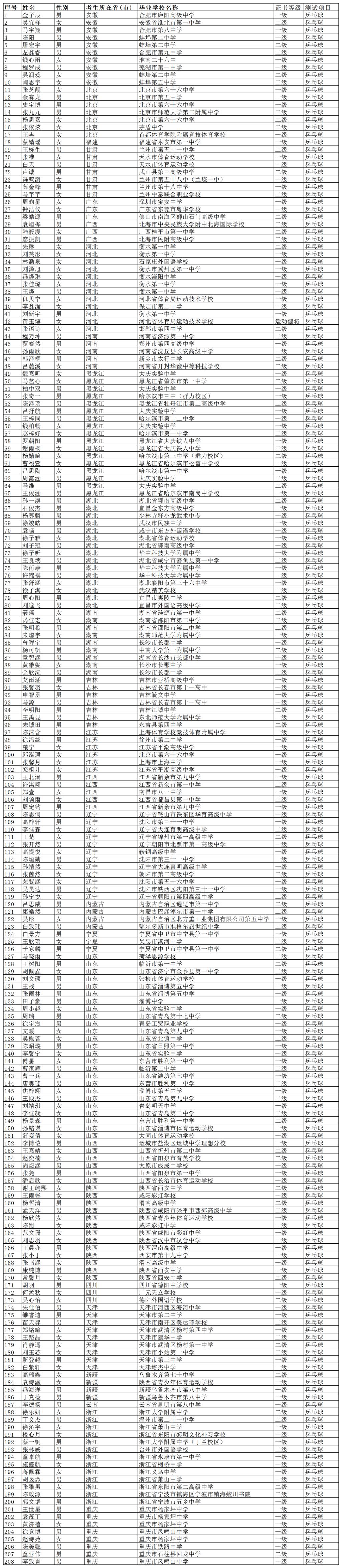 我校2023年高水平运动队招生报名工作已经结束,根据教育部和各省市招生主管部门关于普通高校高水平运动队招生工作的有关文件精神和《兰州交通大学2023年高水平运动队招生简章》相关要求,我校对报考考生进行了资格预审,共有208名乒乓球项目、106名田径项目和1313名足球项目考生顺利通过。详细名单公示如下(公示期截止至2023年3月22日,公示期间有问题请及时反馈):一、乒乓球合格名单二、田径合格名单三、足球合格名单