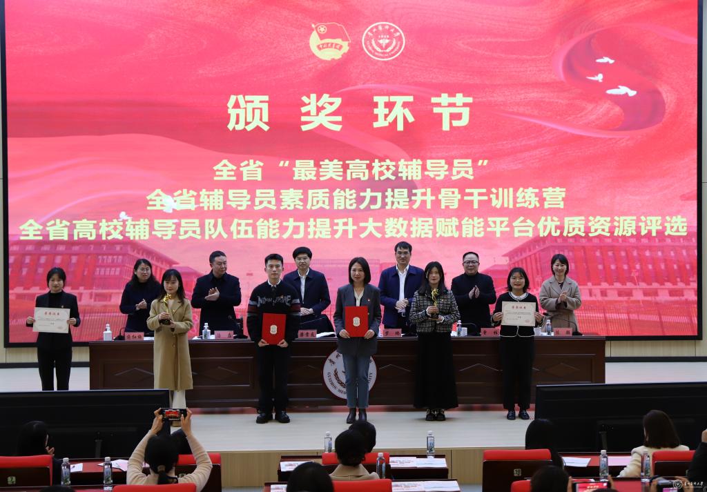 曾柱宣读《省委教育工委省教育厅关于公布2023年贵州省“最美高校辅导员”评选结果的通知》《2023年贵州省高校辅导员素质能力提升骨干训练营表彰名单》《省教育厅办公室关于公布全省高校辅导员队伍能力提升大