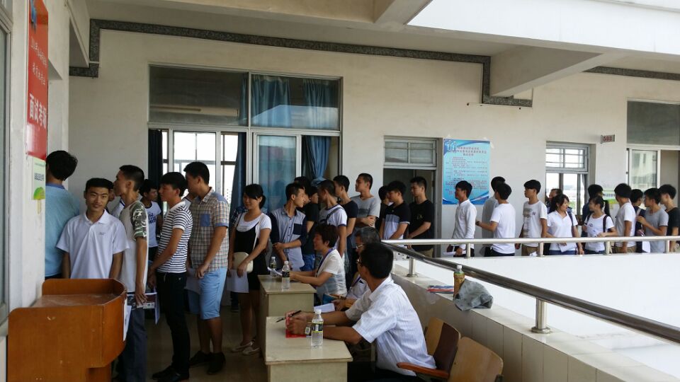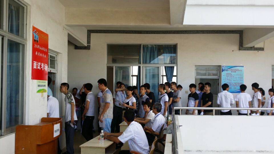 7月1日,根据省考试局的安排,我院在海南职业技术学院第一教学楼501、502教室举行提前批面试,面试现场场面热闹,考生们排起长队,面试组的老师耐心细致地组织考生填写签到表、考生面试表,还为考生发放我院《2014年招生简章》和矿泉水,服务热情周到,面试程序规范,严谨认真。人气高涨的面试现场引来了许多媒体记者进行拍摄和采访。