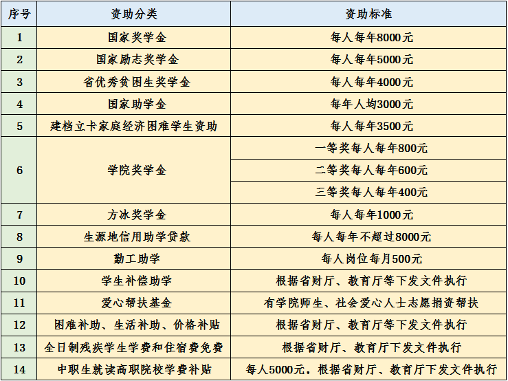 我院全面落实高校对优秀学生、贫困家庭学生的奖励资助政策,主要包括奖学金、助学金、少数民族大学生成才计划奖助金、生源地信用助学贷款、勤工助学、困难补助、绿色通道等资助项目。受各类奖助学金奖资助学生的覆盖面达55%。对新生中家庭经济困难且无力支付学费的,实行先办理入学手续,并解决生活困难,在对其困难情况进行核实,采取不同措施给予资助。