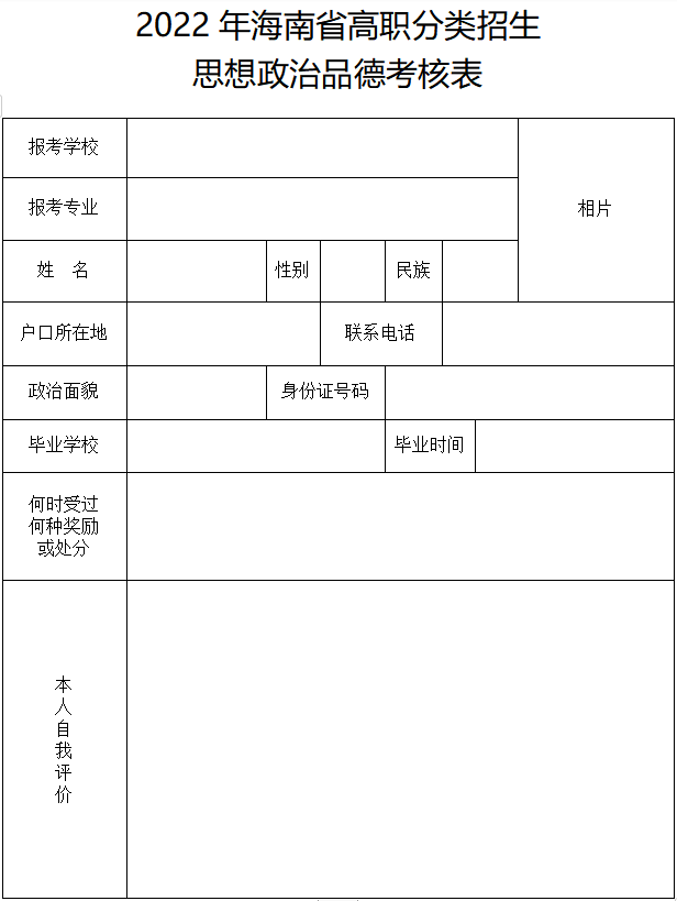 4.《2022年海南省高职分类招生思想政治品德考核表》