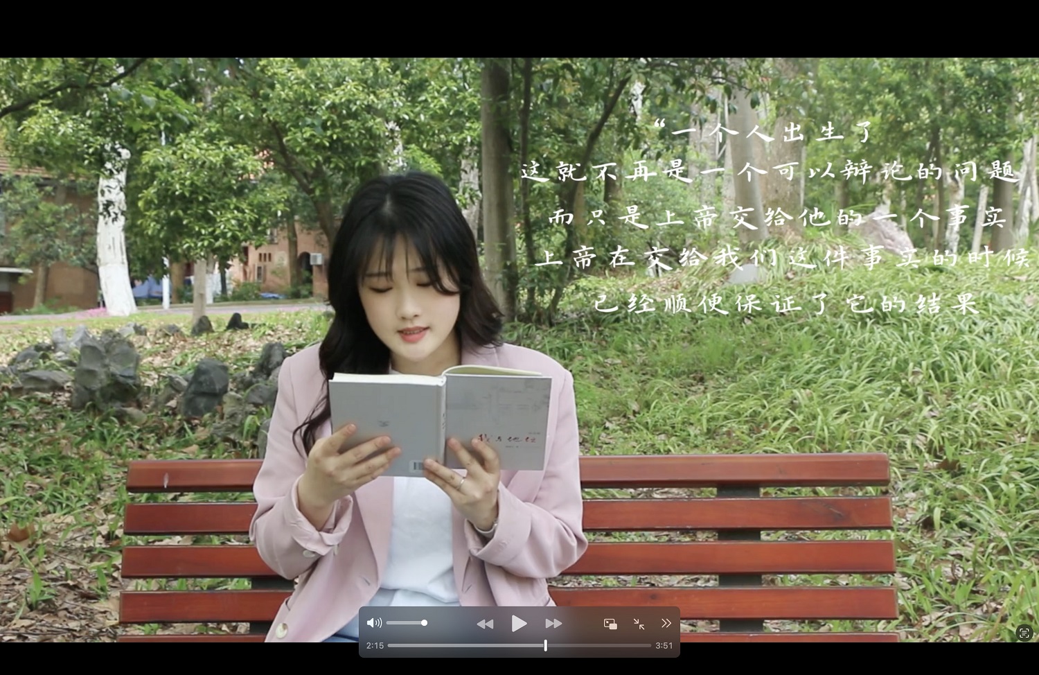 “假如世界上没有了苦难,世界能够存在么?要是没有愚钝,机智还有什么光荣呢?要是没了丑陋,漂亮又怎么维系自己的幸运……”动科动医学院彭泰筼、邹思颖同学录制视频分享了史铁生的《我与地坛》片段。视频中读者不仅分享了书本内容,还回顾了史铁生的人生经历。读书的镜头与史铁生的影像镜头来回切换,如同一本流动的书籍。