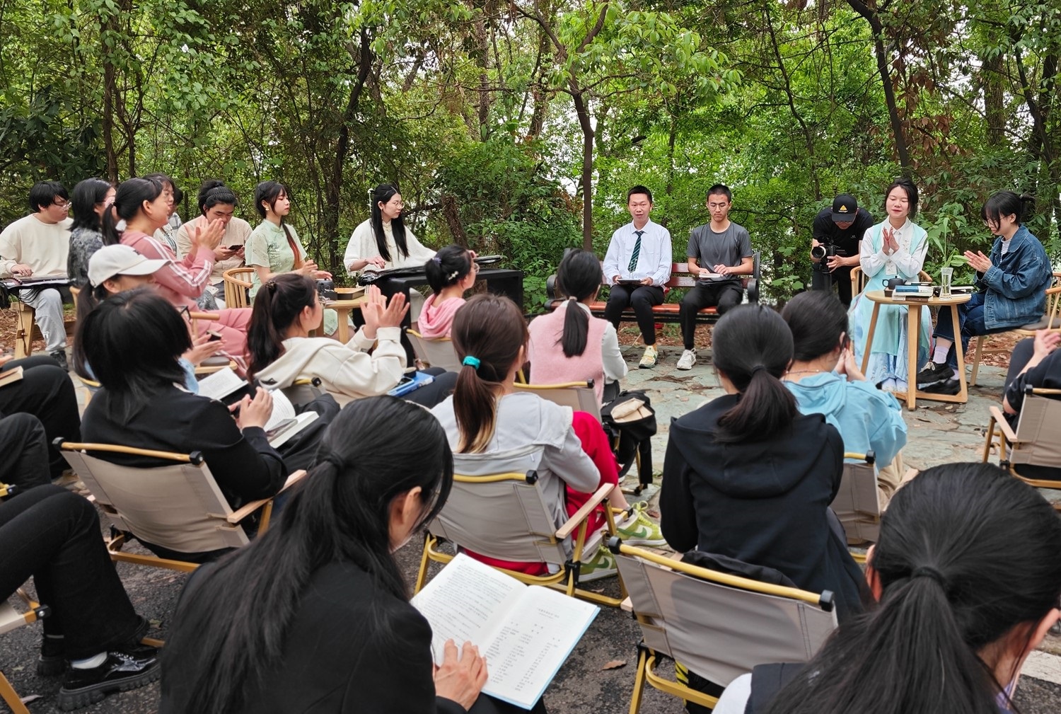 理学院于狮山林中路举办了“林中路读书会——大自然的读书会”活动,来自不同学院的近40余名师生相约树木幽幽苍翠、藤蔓花草杂生、好鸟嘤嘤成韵的大自然里共同探讨文学。经管院任汉铖同学由阅读《瓦尔登湖》提出了自己对于生活的困惑,园林院王滑老师则分享自己的经历和《看不见森林》中的动植物的复杂而微妙的关系,带领大家共同追寻生命的意义。各个学院的同学纷纷分享自己的读书感受。随后,理学院祝鑫老师与研究生周志鹏、陆飞帆不约而同地选择在现场深情朗诵《飞鸟集》里的诗句,文化办冯楠老师则深情朗读了为此次“林中路”读书会创作的诗歌《林中路之问》,参与活动的同学都感到收获颇丰。