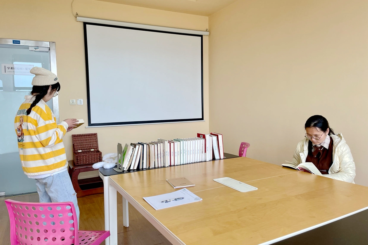吴沛珊同学(左)与吴盼盼同学在阅读室读书(学通社记者 朱亿 摄)