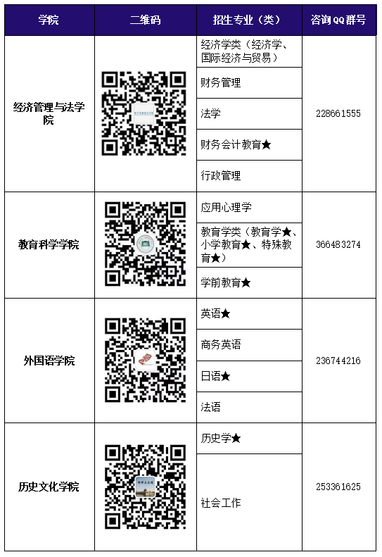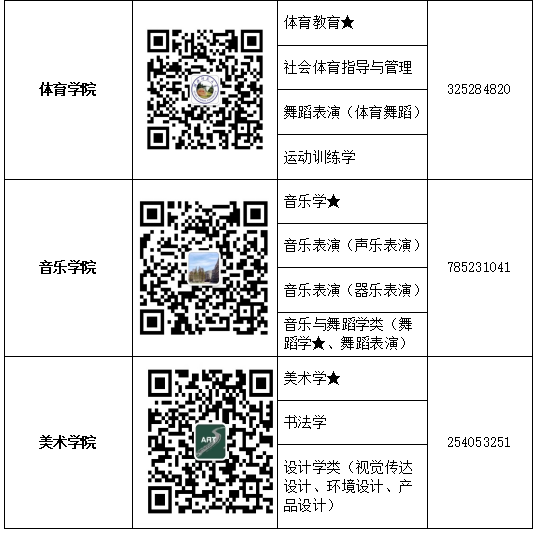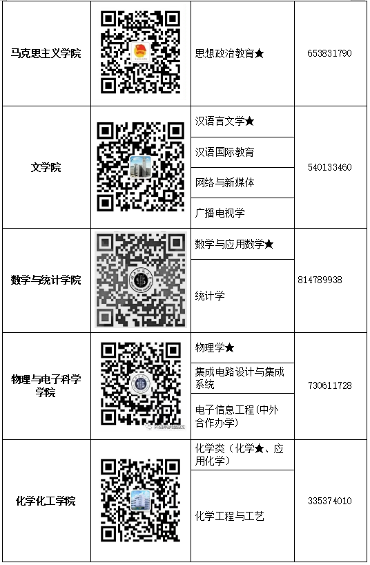 答:可以扫描以下微信公众号二维码,进入各学院相关页面,查询到各学院最新动态,如想进一步面对面与学院老师沟通,可打开手机QQ,通过右上角添加功能,输入招生咨询QQ群号,进群后可以详细咨询各学院相关信息(标★的为师范类专业)。