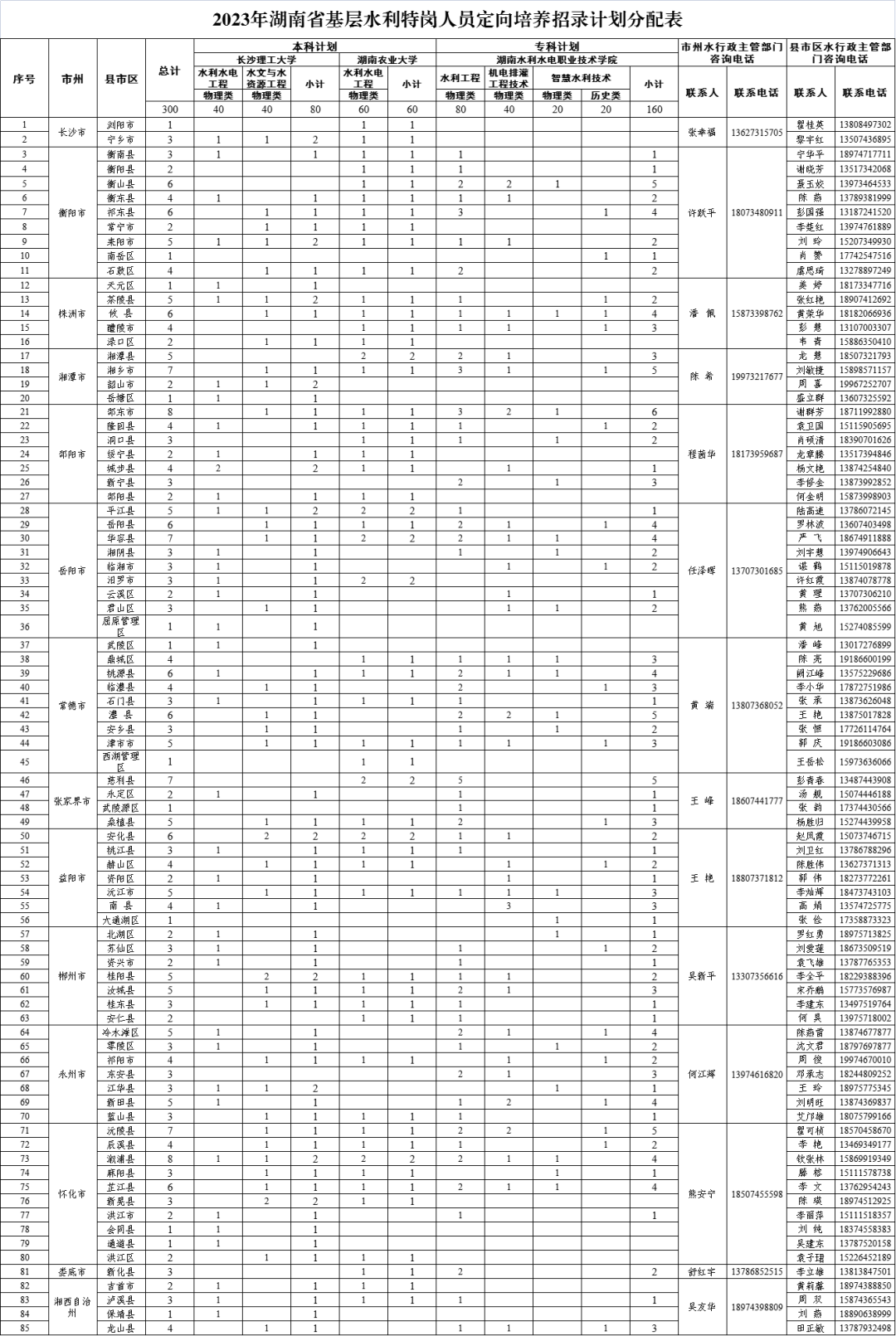 近日,湖南省水利厅、省教育厅、省人力资源和社会保障厅联合下发《关于做好2023年基层水利特岗人员定向培养招录工作的通知》,计划定向培养招录300人,其中本科层次140人,由长沙理工大学、湖南农业大学定向培养,学制4年;专科层次160人,由湖南水利水电职业技术学院定向培养,学制3年,根据培养层次分别执行普通本科、高职(专科)录取控制分数线。300个定向培养招录计划分学校、分专业、分科类全部下达到有需求的县市区,随通知一并向社会公布。