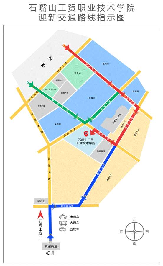 3.因学院门口星光大道高铁建设施工,请所有新生及家长按照下图所示路线图选择就近乘车路线。