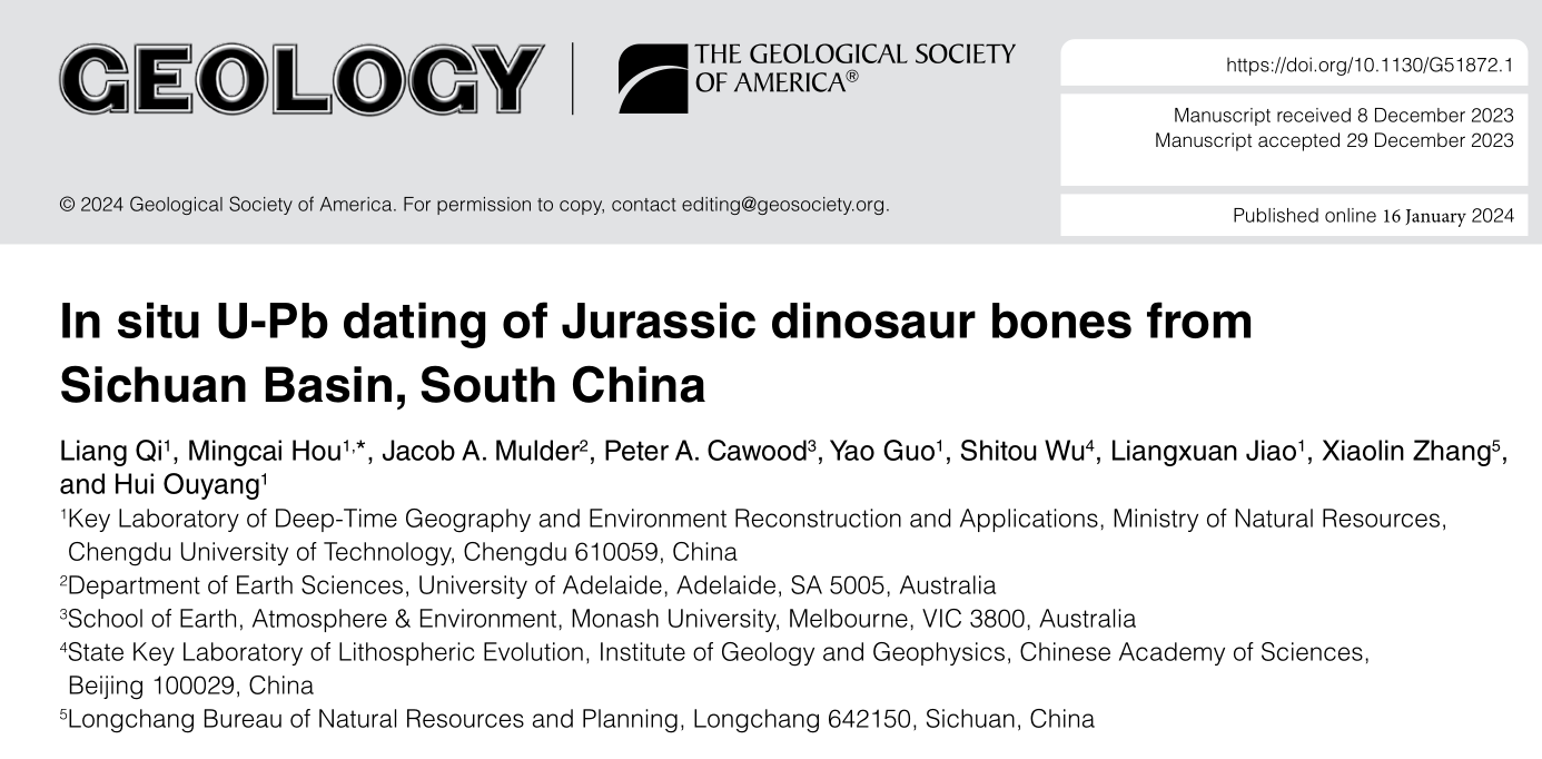 Qi, L., Hou, M.*, Mulder, A. J., Cawood, P. A., Guo, Y., Wu, S., Jiao, L., Zhang, X., Ouyang, H. In situ U-Pb dating of Jurassic dinosaur bones from Sichuan Basin, South China : Geology, https://doi.org/10.1130/G51872.1 .