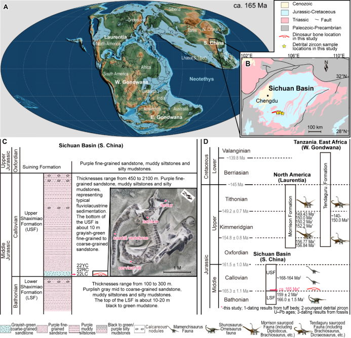 图1 (A) 约165 Ma古地理重建; (B) 四川盆地地质图及化石所在位置;(C) 四川盆地沙溪庙组地层柱状图及化石照片;(D) 华南沙溪庙组、北美Morrison组及东非Tendaguru组地层对比图。