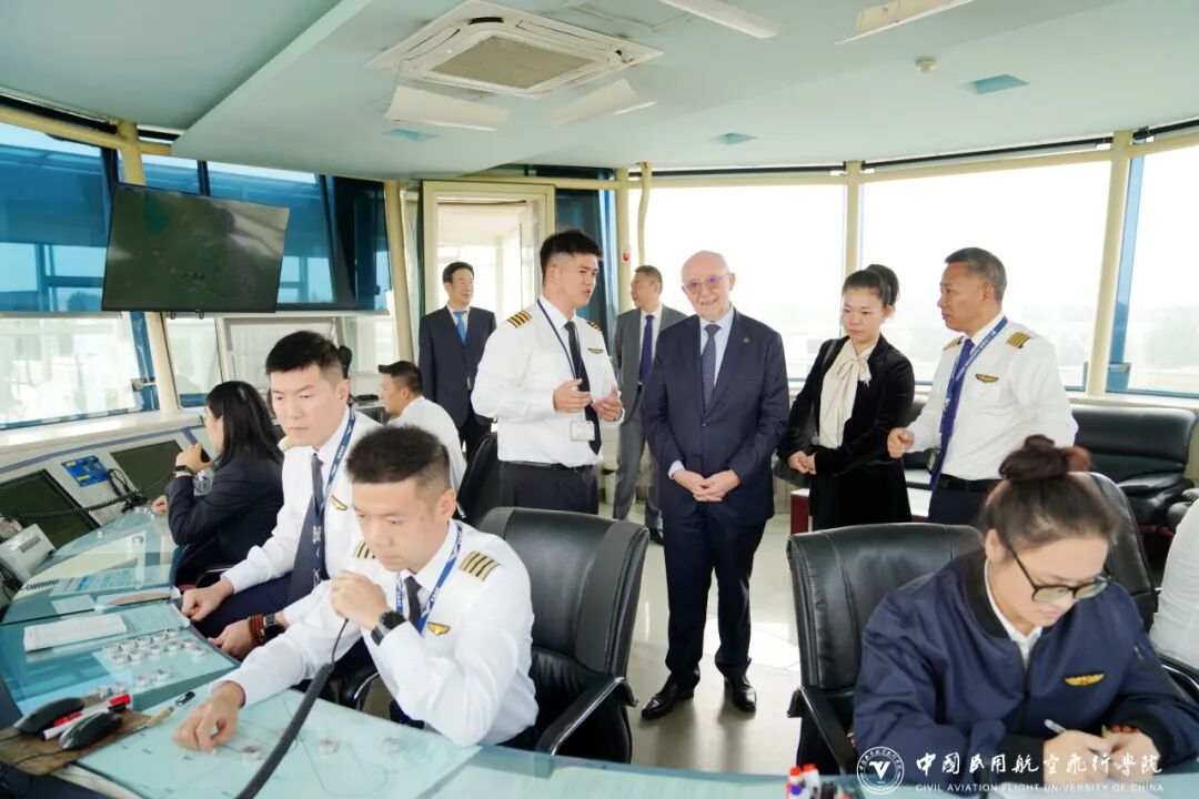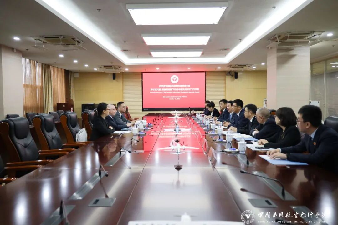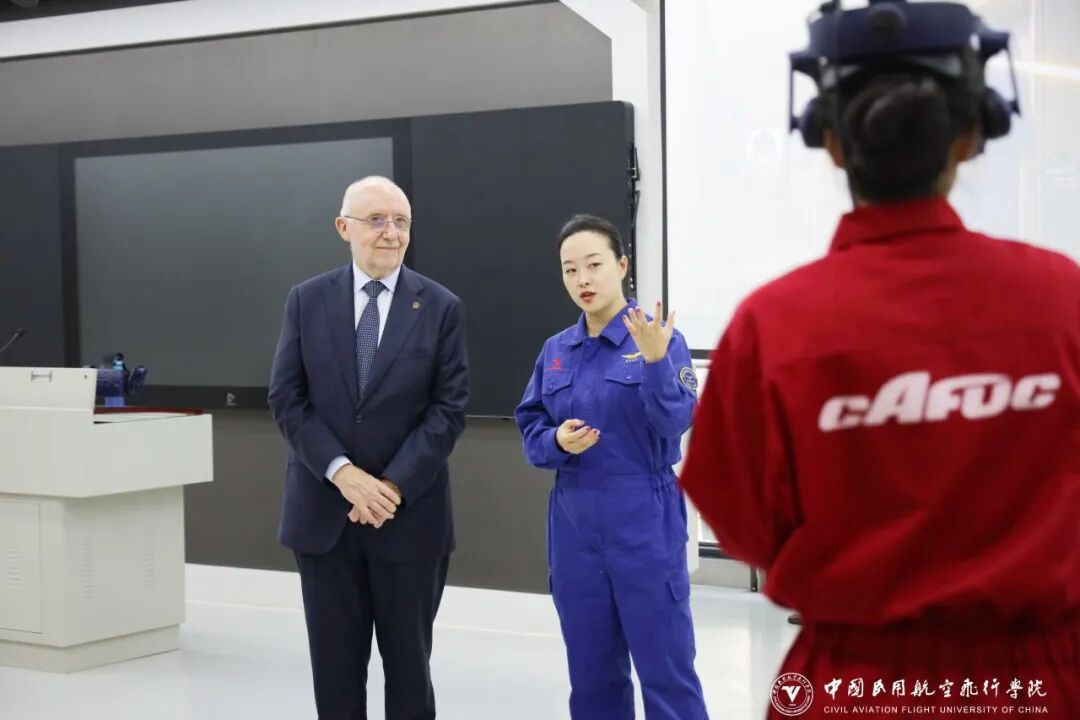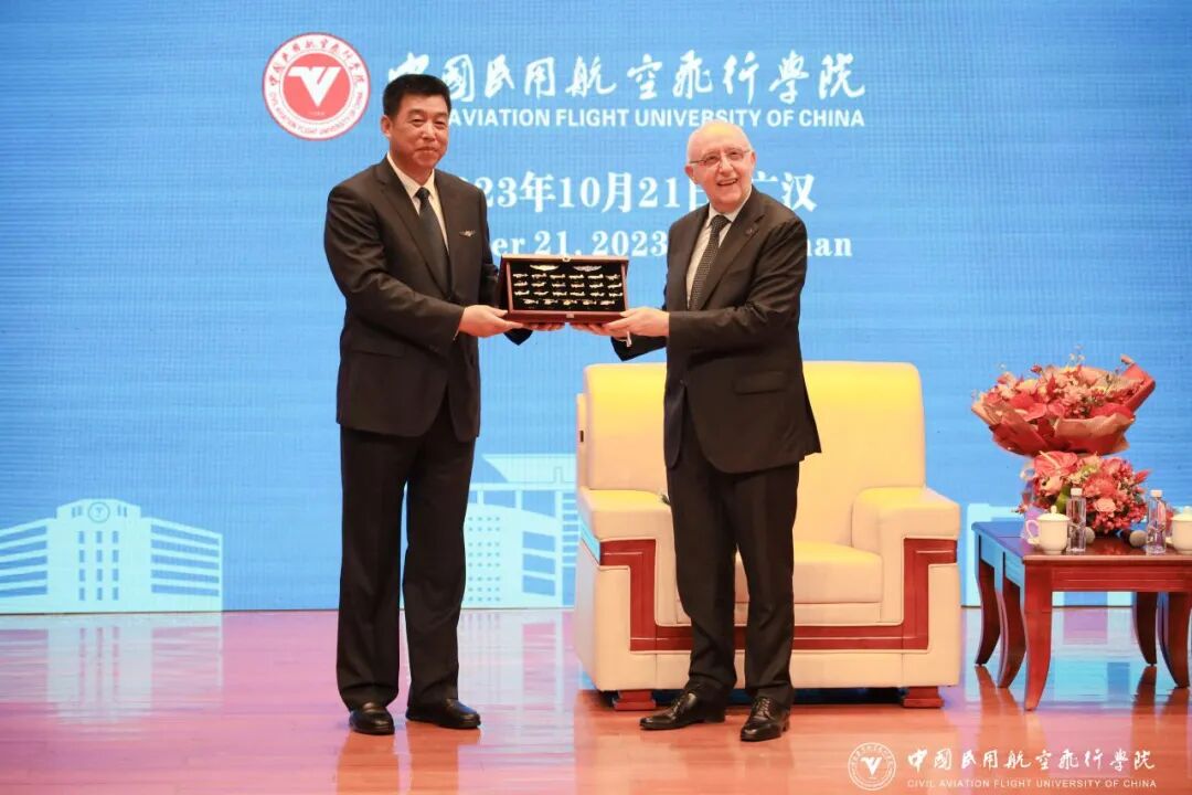 讲座前,夏基塔诺听取中飞院办校历史及未来发展方向,并围绕下一代航空专业人才培养等方面进行座谈交流。
