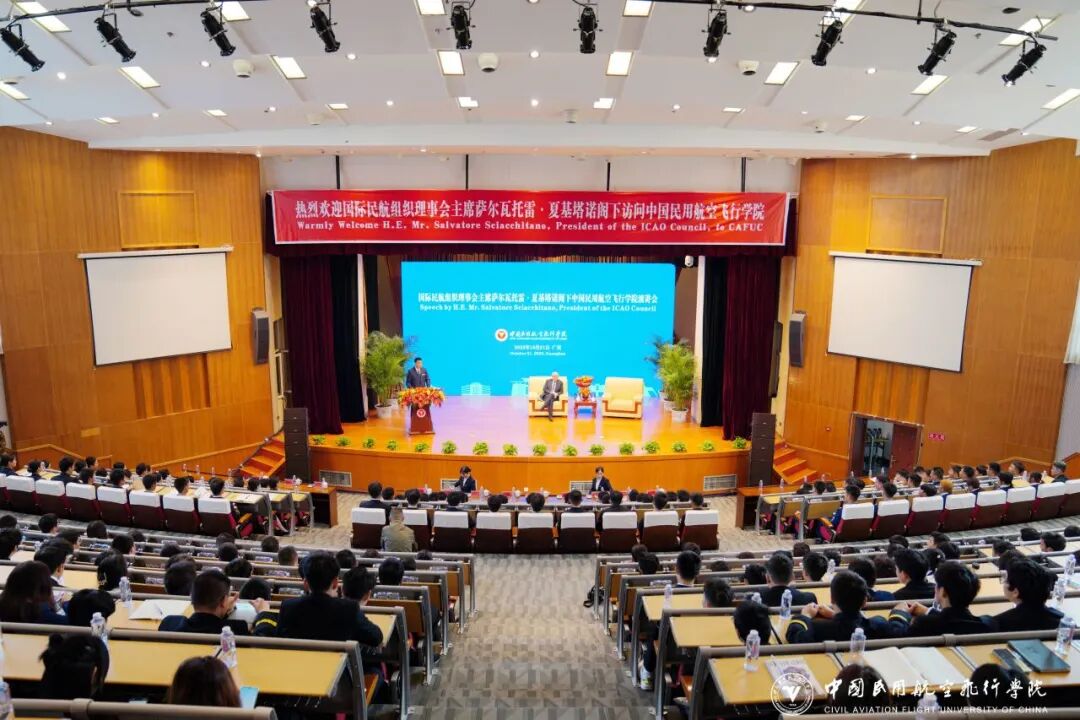 夏基塔诺在学院图书馆报告厅作《国际民航组织情况及未来发展》主题演讲。演讲中,他回顾了国际民航组织创办的历史,并指出未来民航业发展可能面临的挑战以及机遇。