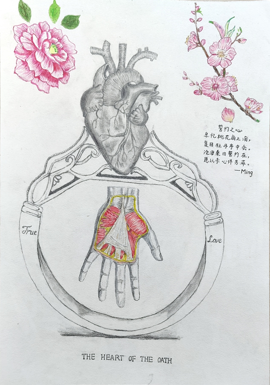 作品介绍:誓约之戒,以心为钻,为爱加冕。指尖上耀眼的钻戒,是爱情的象征,也是至死不渝一生的誓约。本作品由心脏镶嵌的戒指和一只托举的手构成,象征着真心的托付;左右配以牡丹和桃花,寓意着牡丹亭和桃花扇两个关于爱情的典故。作品中有英文、古诗、花朵和器官等元素存在,体现了