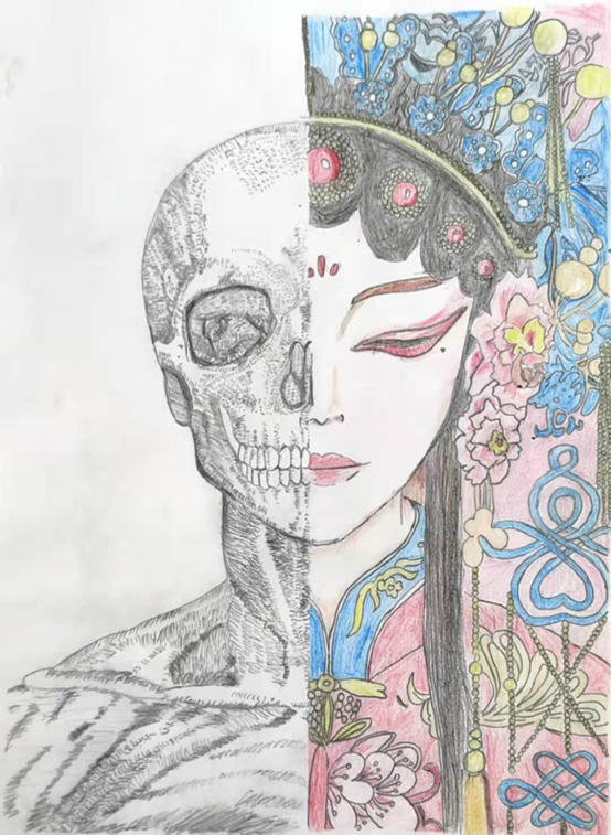 作品介绍:本画分为左右两部分,左部为人体骨骼,右部为戏曲演员,将其结合不仅增添了该作品的艺术气息,也暗示了