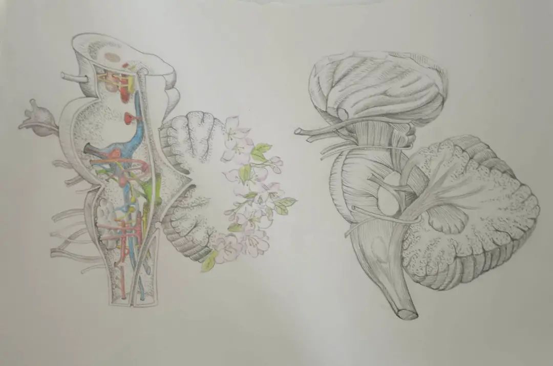作品介绍:袅袅春风,灼灼海棠,伴随着春日的阑珊美意,海棠树下与友人共席而餐,嗅神经帮助我们闻到了阵阵花香;微风拂来,视神经让我们看到了落英缤纷;进食的过程中舌咽神经控制分泌唾液,并与面神经一并尝到了美食的滋味……在我们的日常生活中,12对脑神经及其核团的作用无处不在。因此作品的第一部分着重描绘了脑干中部分核团的位置关系,小脑部分被春日的海棠花所覆盖,于是在第二部分展示了小脑与大脑的连接,即小脑的三对脚。谨此,通过多彩的画笔,为