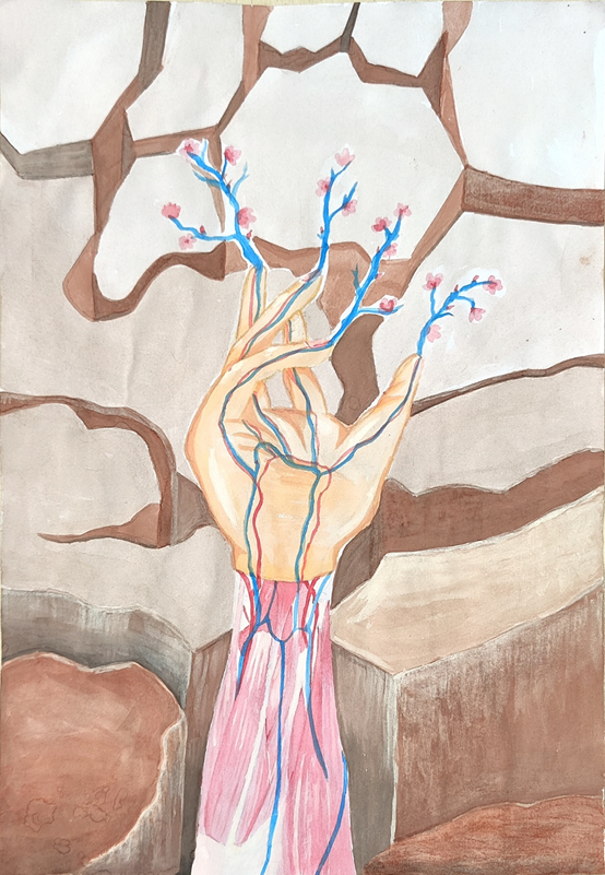 作品介绍:画面中一片大地上,一只筋肉强健的手缓缓托举起希望,静脉和动脉交缠着从指尖开出一片海棠之花。这幅画意味着