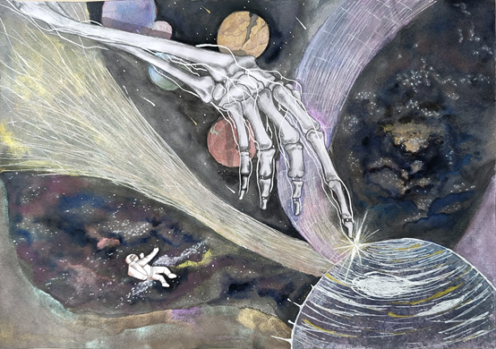 作品介绍:本作品主体为解剖学上的手骨与手部神经部分,以及即将触碰到的明亮星辰。延伸的手骨代表着人类的渴望,神经代表着每个人的内在驱动和外在感知,而星辰代表着未来的光明与未知,本作品旨在表达人类在历史发展过程中始终持有对知识的渴求、以及与未知事物的探索,也象征着