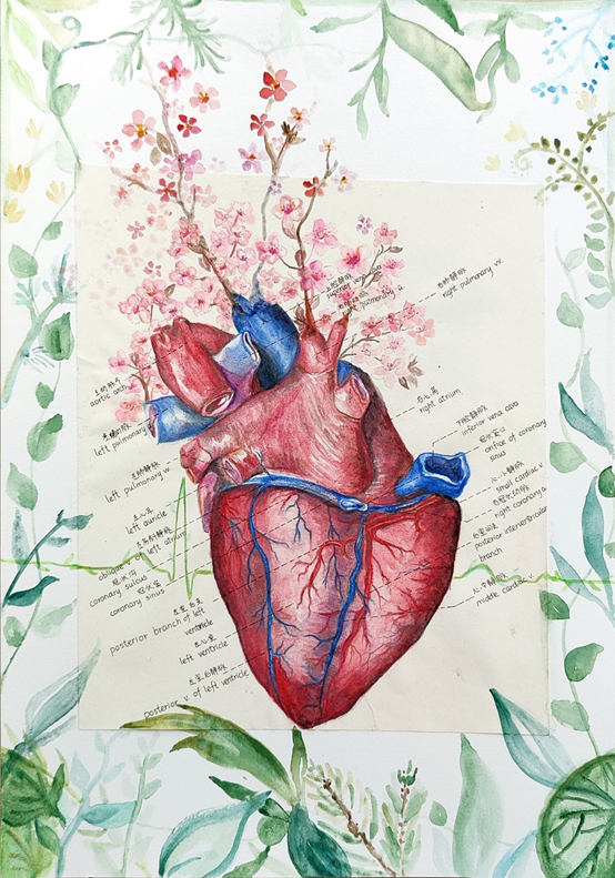 作品介绍:本作品以富有生命力的心脏借由科技与人类对话作为主题,选取心电图和表面血管分布明显的心脏后面观,既突出心脏的血液充盈和立体感,又表现出一腔热血、生机勃勃的涵义。主要利用水溶性彩铅、马克笔和水彩,以写实心脏为中心主体,上方伸展出紫叶李花束,背景为一周期正常的健康心电图,图画上层为对实体心脏按比例放大绘图后的标注。紫叶李,又名红叶李,象征幸福、积极、向上,寄托着美好事物与正能量,也降低写实不适感。