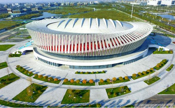 体育馆外形独具匠心,蕴含中国传统文化精髓和现代动感节律,远观如太极幻化,阴阳相抱,又如华美竖琴,设置5000余观众座位。