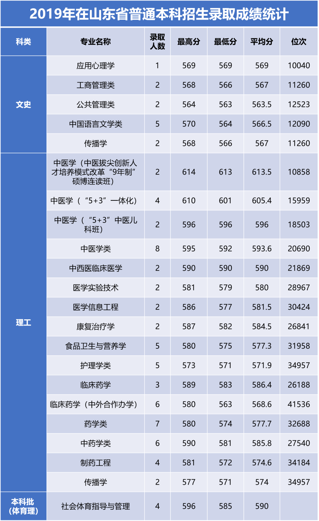 2021年我校在山东省招生人数为86人专业23个,招生人数86人,包括:中医学(中医拔尖创新人才培养模式改革“9年制”)、中医学(“5+3”一体化)、中医学(“5+3”中医儿科班)、中医学类、临床医学、中西医临床医学、医学技术类、医学信息工程、康复治疗学、食品卫生与营养学、护理学类、临床药学、临床药学(中外合作办学)、药学类、中药学类、中药学(拔尖学生培养基地班)、制药工程、应用心理学、工商管理类、公共管理类、中国语言文学、传播学、社会体育指导与管理,提档最高分数627分,为中医学(中医拔尖创新人才培养模式改革“9年制”)专业;提档最低分数554分,为临床药学(中外合作办学)专业,排位在山东省56253位。社会体育指导与管理专业招生人数5人,提档最高分数628分,提档最低分数621分。