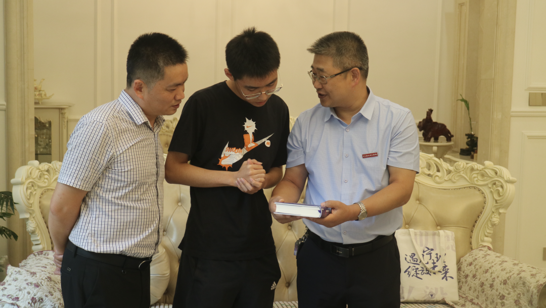 在父亲和爷爷奶奶的见证下,腼腆的王同学略显激动地从张老师手中接过录取通知书。一旁的张峰老师拿出了纪念品中的一个精致的钥匙扣,勉励道:“这个卡通形象‘宁小理’是我们学院前几届的学长学姐们设计的,如今已经成为我们学校的吉祥物,并受到了广大校友、学生和网友们的喜爱,希望你能够向学长学姐们学习,在专业领域中开辟属于自己的新天地。”