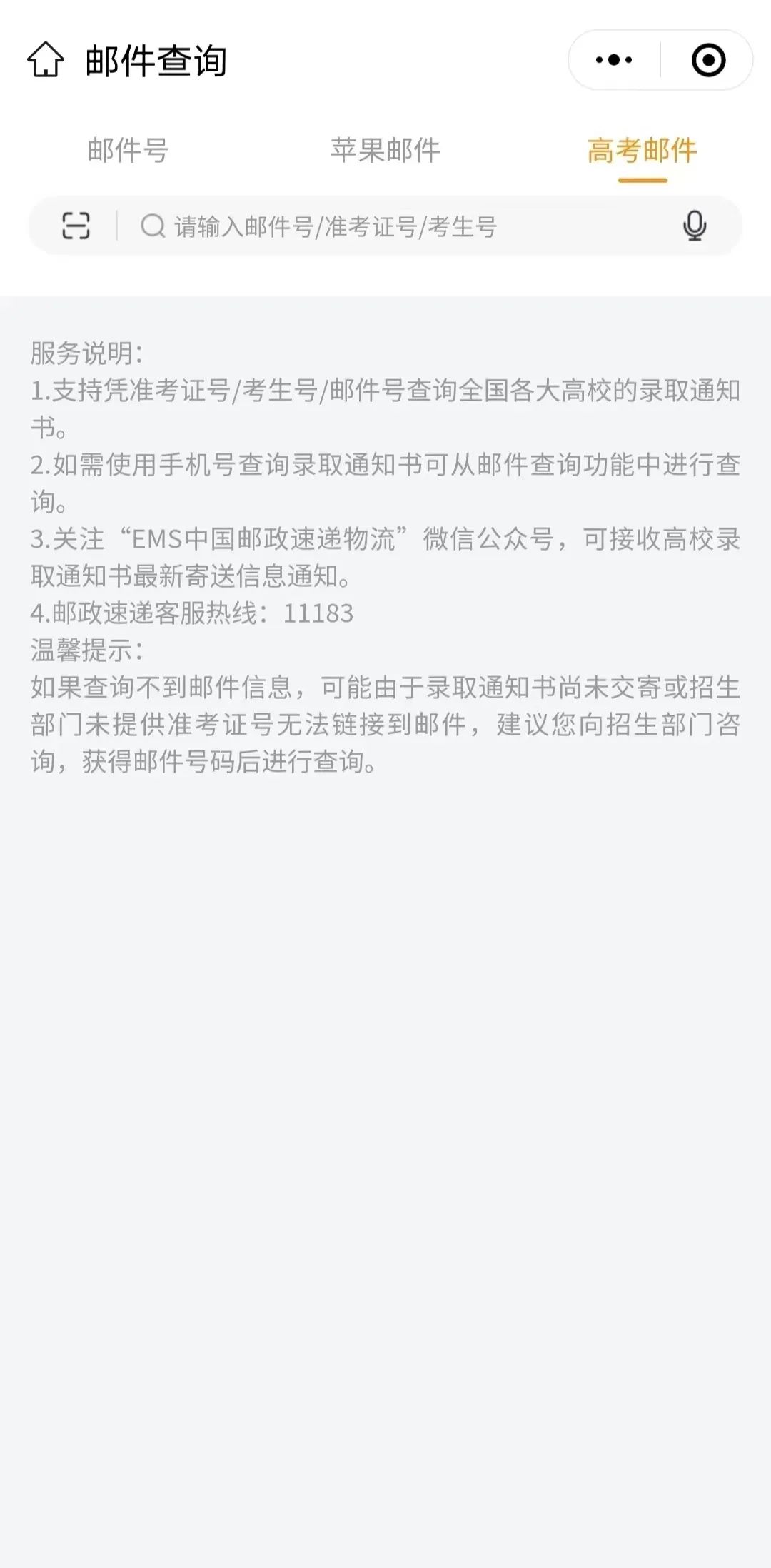 注:如果查询到的结果是“暂无运单信息”,可能是因为邮政还在打包扫码处理邮件中,发货量较大,请同学们耐心等待,过段时间再查查看。请大家保持联系电话通畅,如需修改派件地址可直接联系EMS客服(电话:11183)处理。