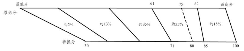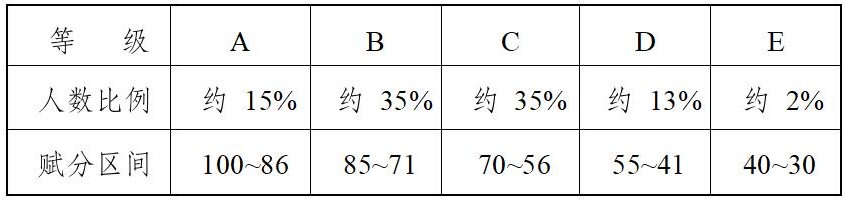 具体转换步骤如下:第一步,按照每门选择性考试科目考生的原始分从高到低划定A、B、C、D、E共五个等级,各等级人数所占比例分别约为15%、35%、35%、13%和2%,将考生的原始分转换成等级。第二步,将A至E五个等级内的考生原始分,依照等比例转换方法,分别对应转换到100~86、85~71、70~56、55~41和40~30五个分数区间,得到考生的等级分。每门选择性考试科目等级分数的转换基数为实际参加该科目考试并取得有效成绩的人数。具体选择性考试科目等级分转换方法及示例如下: