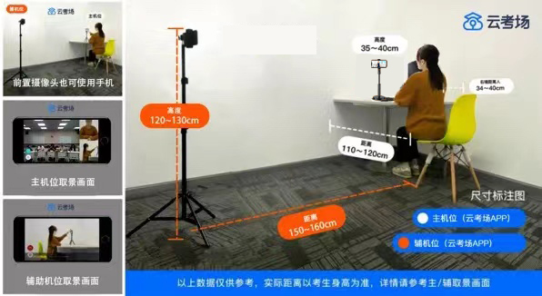 我校将采用双机位双摄像头进行。主摄像头(手机摄像头)放在考生正面,用于考生和考官进行正常考试交流;第二摄像头(手机摄像头)放在考生侧后方,用于监督考生在考试过程中的动作及考生周围环境情况,确保考试公平公正。
