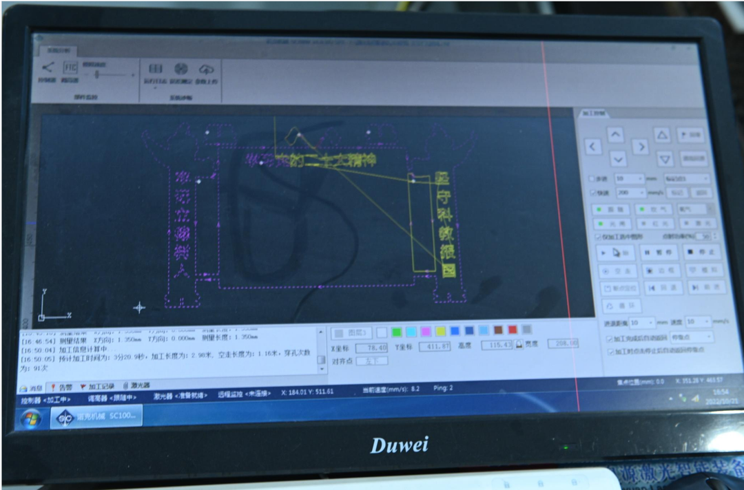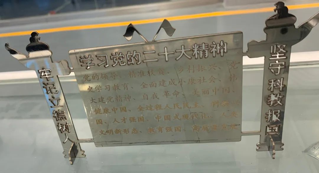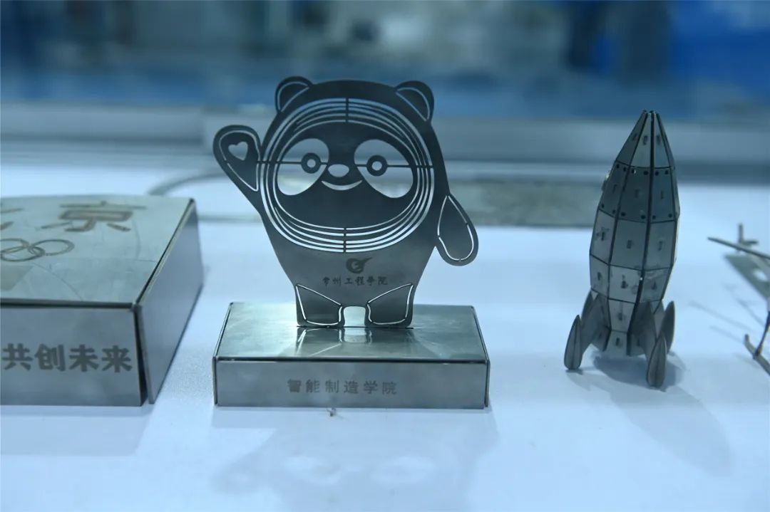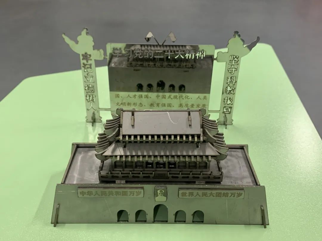 在《机器人焊接基础》的课堂上 ,焊接21级的同学们在吴叶军老师的带领下,成功设计制造出了天安门模型,“不仅锻炼了图纸设计、切割和焊接的能力,而且通过学习二十大报告中‘金句热词’进行激光切割,立体呈现,这让我们对二十大报告有了更加深入的了解。”同学们纷纷表示。