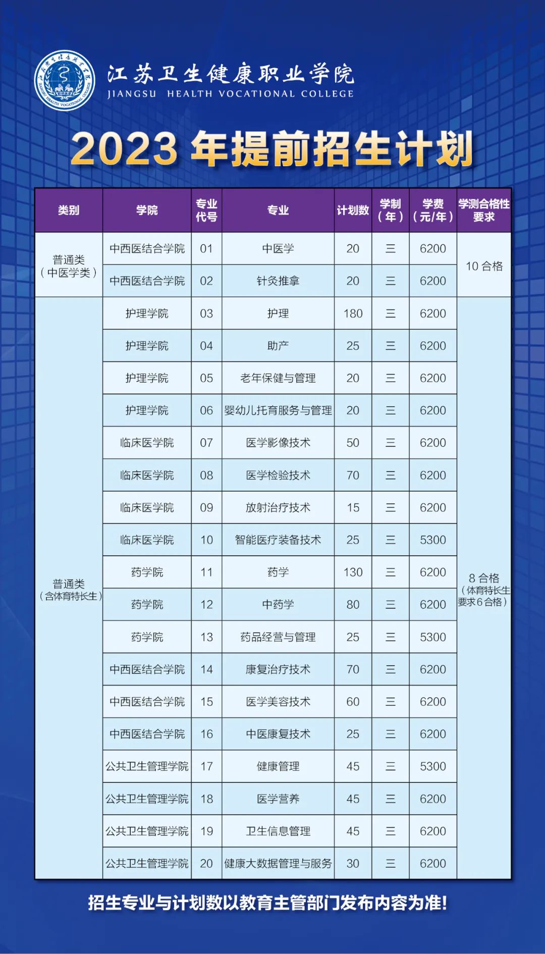 1.考生须参加江苏省高校招生统一体检,并符合《普通高等学校招生体检工作指导意见》有关要求;中医学、针灸推拿、护理、助产、老年保健与管理、婴幼儿托育服务与管理、医学影像技术、医学检验技术、放射治疗技术、药学、中药学、康复治疗技术、医学美容技术、中医康复技术不招色盲、色弱者。护理、助产专业申请护士执业注册时还需符合《护士执业注册管理办法》规定的健康标准:无精神病史;无色盲、色弱、双耳听力障碍;无影响履行护理职责的疾病、残疾或者功能障碍。助产专业建议女生填报。2.已被提前录取的考生,不再参加6月份的普通高校招生统一考试和任何其他形式的录取。确需参加高考的,须向高考报名地县(市、区)招办提出书面申请,经批准后方可参加,但不能参加任何形式的录取。