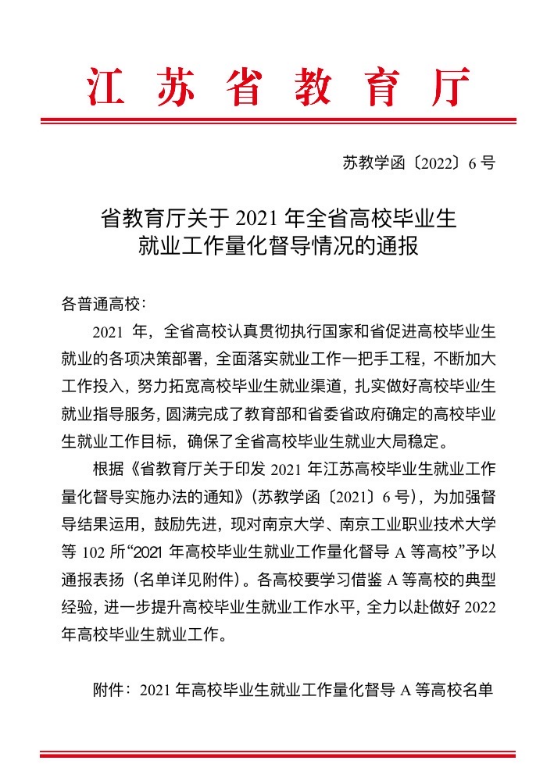 近日,江苏省教育厅发布《省教育厅关于2021年全省高校毕业生就业工作量化督导情况的通报》(苏教学函[2022]6号),我校再次荣获全省高校毕业生就业工作量化考核A等。