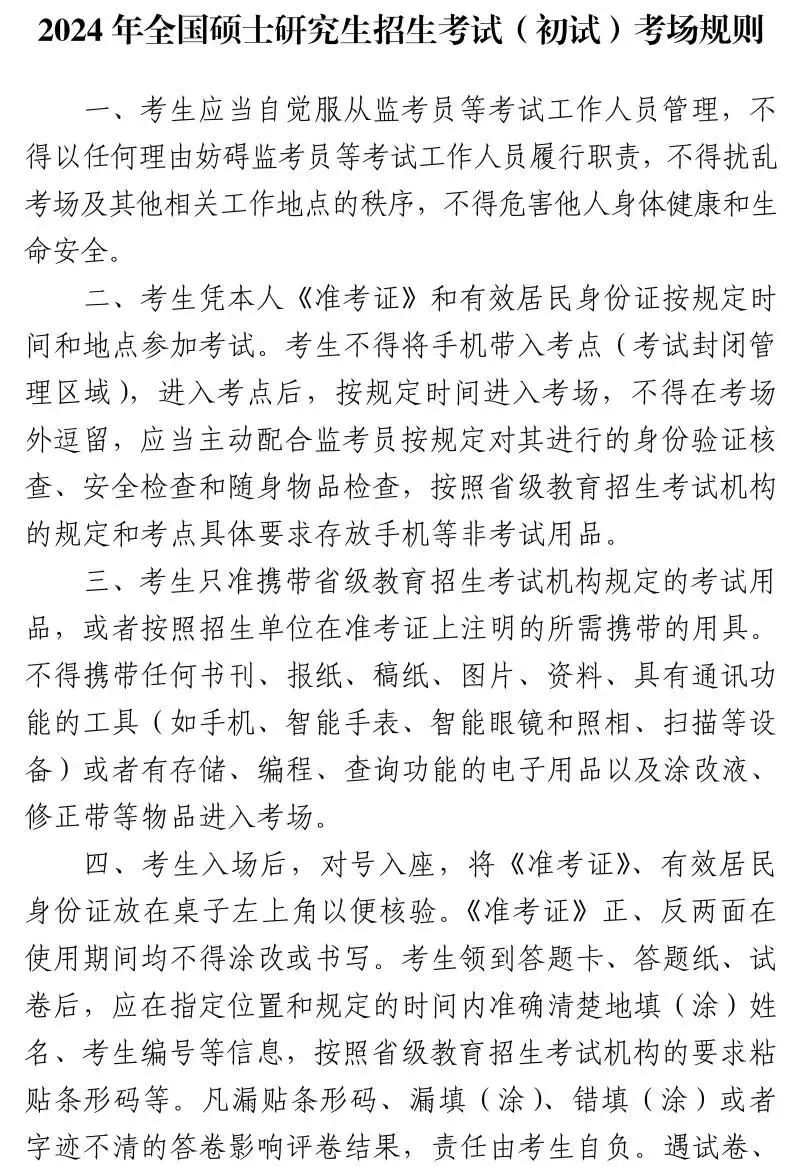 8.诚信参加考试。研考考场安装有视频监控系统,每名考生的一举一动均被全程记录。考试期间,教育、公安、网信、无线电管理等部门将对考场内及周边环境进行整治,对涉嫌利用通讯工具作弊人员进行严肃查处,涉嫌犯罪的追究刑事责任。考生须认真阅读《考场规则》,如有违规、违法行为将按《中华人民共和国教育法》《国