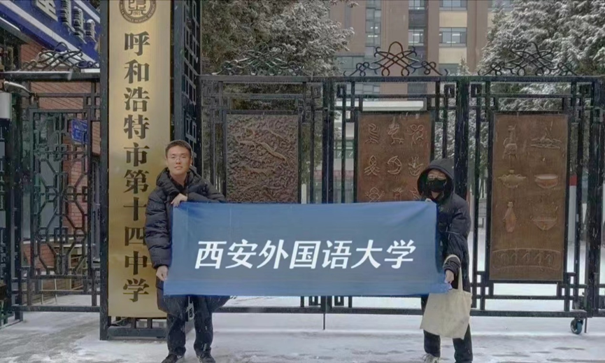 2024年1月14日两位队员到达呼和浩特市第十四中学,并在校门处进行合影。随后两位队员到达高三办公室,与老师沟通,商谈宣讲事宜。2024年1月15日活动正式开始,两位队员通过演示文稿向全班50多名同学展示了