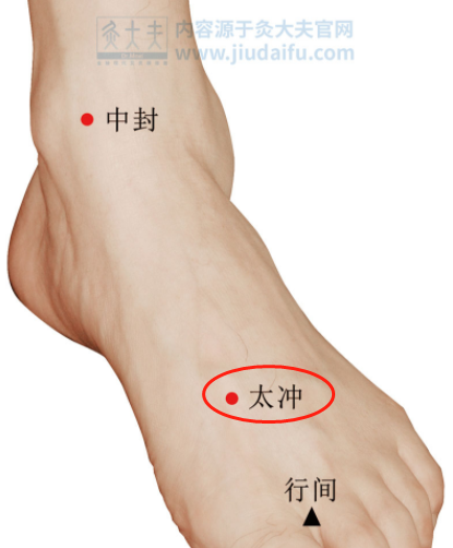 太冲穴位于足背侧,当第1、2跖骨结合部之前凹陷处。每次按揉肝经上的太冲穴5分钟左右,有酸胀的感觉即可,既可解郁散结,又能疏肝理气。