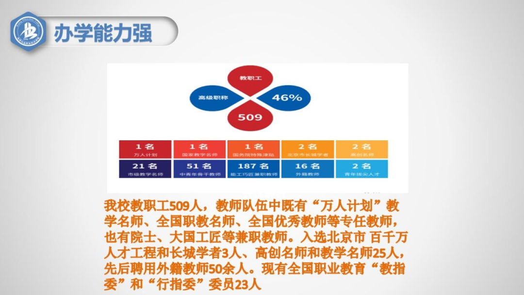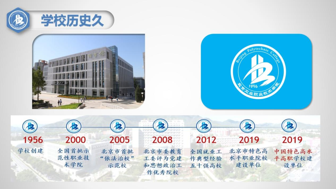 学校定位于立足首都城市发展战略,面向首都城市建设、运行、管理、服务领域,为首都高质量发展着力培养复合型国际化高素质技术技能人才,打造技术技能创新服务平台。现有教职工500余人,在校生6000余人,共开设专业39个。从优质校到示范校,再到双高校,北工院取得了职教领域不同阶段的所有最高荣誉。特别是在2019年,学校被教育部列为集中力量建设引领改革、支撑发展、中国特色、世界水平的高职学校(即国家双高建设学校,全国仅56所,相当于本科双一流学校),学校的办学实力又一次得到了强有力的展现。