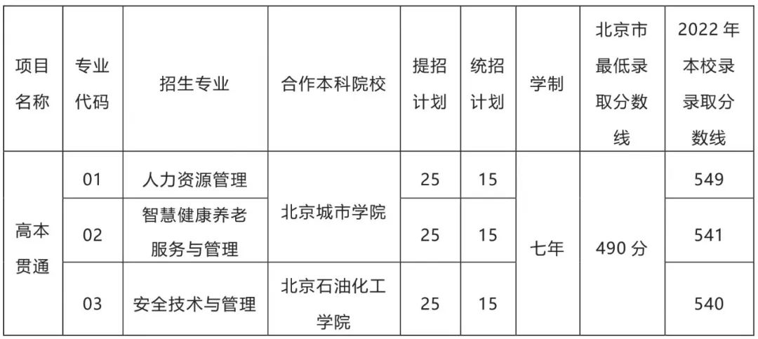 由入选“北京市特色高水平职业院校”的高职院校与本科高校联合培养。前5年在高职院校学习,后2年在本科高校学习。完成前5年学业且成绩合格者由高职院校颁发专科学历证书,完成全部学业且成绩合格者,由合作本科高校颁发本科学历证书(专升本)。具体情况以当年北京教育考试院公布的招生简章为准。