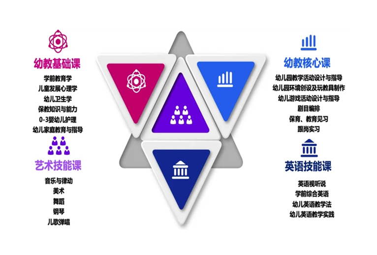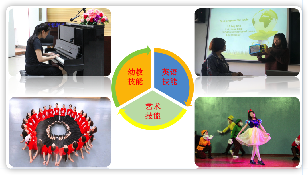 坚持“双语教育+艺术技能”一专多能人才培养模式拥有“双师型”教学团队,打造“厚基础、强技能体系”实施园所对接、课证融通,实岗育人,保障就业。