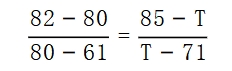 假设某考生思想政治科目合格性考试成绩达到合格,选择性考试科目原始分为80分。第一步,将该科目选择性考试原始分从高到低进行排序,按照规定的等级比例将该考生划定为B等级,该科目B等级的原始分分布区间为82~61;第二步,根据分数转换参数设置,将B等级内的该考生原始分,依照等比例转换法则,转换到85~71分数段。原始分所在区间的下限Y1为61分,上限Y2为82分。相应等级赋分区间的下限T1为71分,上限T2为85分。那么该生的等级分为: