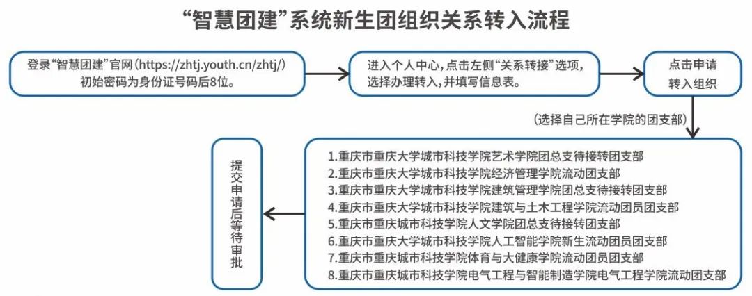 团组织关系转接:在APP“智慧团建”上进行转接申请,转接至新生所在二级学院流动团支部,然后等待二级学院团总支审核,等开学报到,确定新生班级后,由团总支转到班级团支部。
