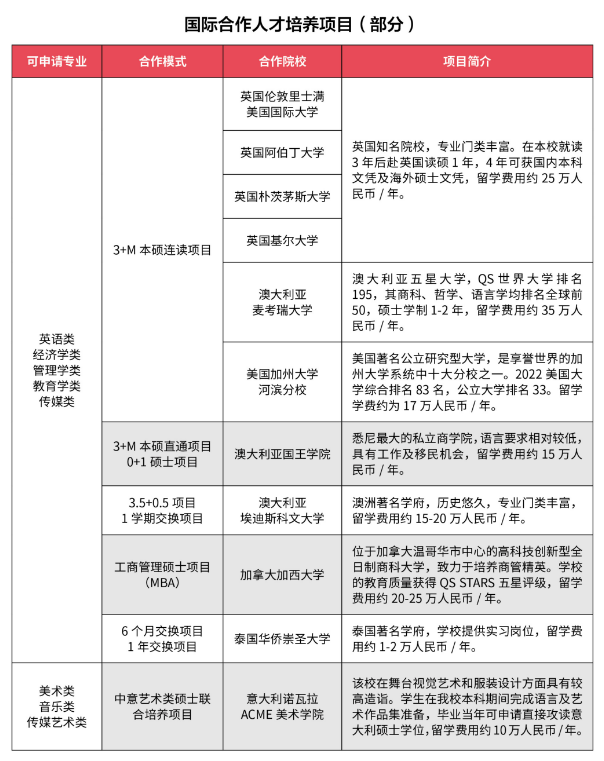 学校坚持国际化办学思路,整合海外优质教育资源,目前学校已经与美国、英国、加拿大、法国、德国、澳大利亚、西班牙、意大利、日本、泰国等国家的40余所高等院校建立了合作关系。我校有多个国际合作交流项目,每一个专业均有对应的留学通道,所有学生均可选择本科双学位、3+M本硕连读、国际班、交换生、寒暑假短期留学等多种方式出国留学。