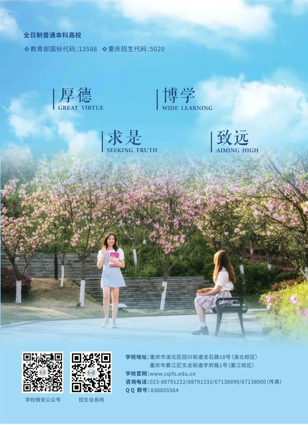 学校秉承“厚德、博学、求是、致远”的校训,弘扬中华传统美德,构建和谐、健康、向上的校风和学风,做品格高尚、博闻强识且有所作为的“重外人”。学校现有7大学生组织,31个学生社团,主要涵盖