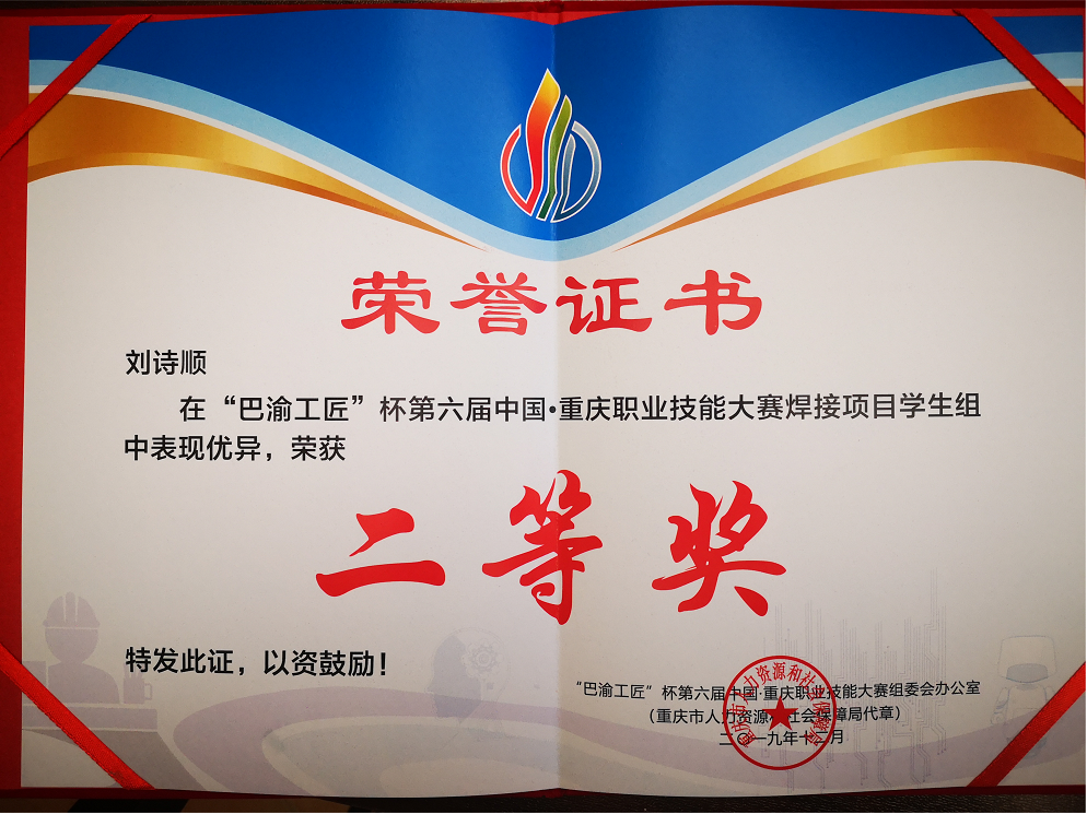 焊接专业学生董小通同学在重庆通用(工业)集团实习期间获得焊接技能比赛第三名的优异成绩,受企业重点培养。