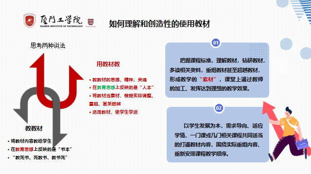 关于教材,一直以来存在着“教教材”和“用教材教”两种说法,体现的是教育思想的“书本”和“人本”两种不同理解。我们应提倡