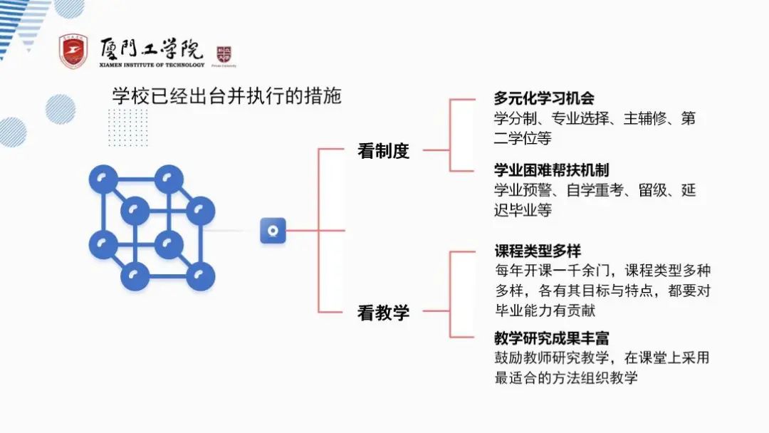 回顾我校这几年的教学工作,在为学生提供良好的学习机会方面已出台了学分制、专业选择、主辅修、第二学位等多元学习制度。我校每学年开设的课程有一千余门,课程类型多种多样,各有其目标与特点,且要求所开设的课程都要对学生毕业能力有贡献。学校鼓励