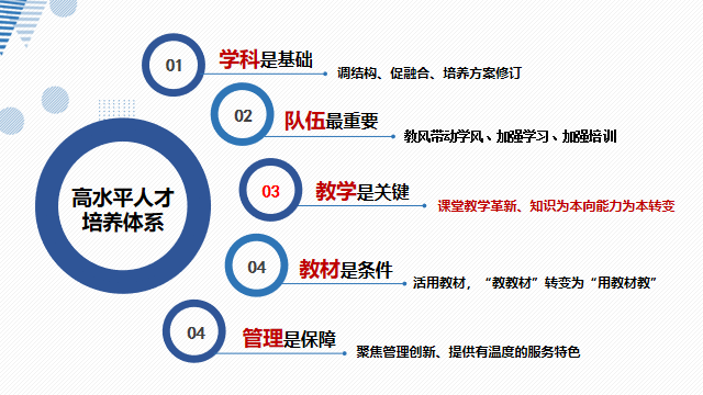 而高水平人才培养体系涉及了学科、队伍、教学、教材、管理等各方面,今天我重点想就教学的课堂改革、教材的使用和内容重组等方面的工作,与目标实现的关系谈一下相关的关键问题。