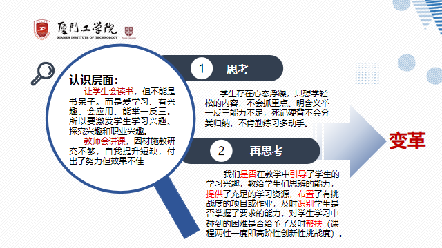 思考:我们是否在教学中引导了学生的学习兴趣,教给学生们思辨的能力,提供了充足的学习资源,布置了有挑战度的项目或作业,及时识别学生是否掌握了要求的能力,对学生学习中碰到的困难是否给予了及时帮扶?