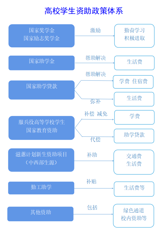 国家在高等教育本专科阶段建立起国家奖学金、国家励志奖学金、国家助学金、国家助学贷款等多种形式有机结合的高校学生资助政策体系。