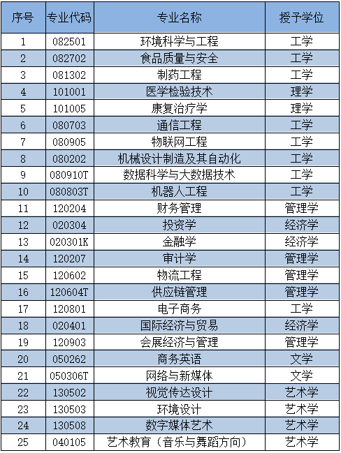 学校办学立足地方、对接产业,重点发展信息与智能机电类、环境与公共健康类、商务与管理类、人文等四大应用型专业(群),培养具有绿色理念、创新精神、国际视野、理论功底扎实、实践能力突出的高素质应用型、创新型、复合型人才。目前已经有25个本科专业,详细专业介绍可进入招生网站查询。