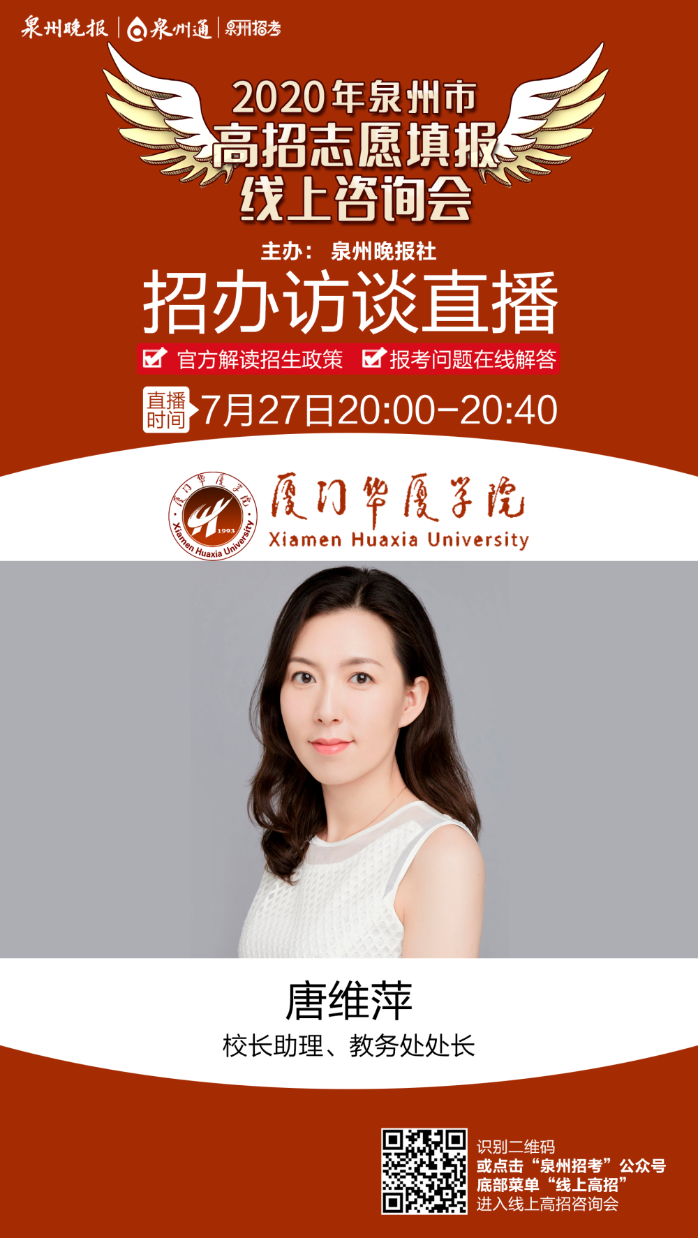 填报志愿时间临近,考生们心中的疑惑很多,想问的问题也很多,今天华厦招办为您一一梳理和解答,让您一次了解到位,同时7月27日在泉州晚报平台还为您准备了在线直播,敬请关注。